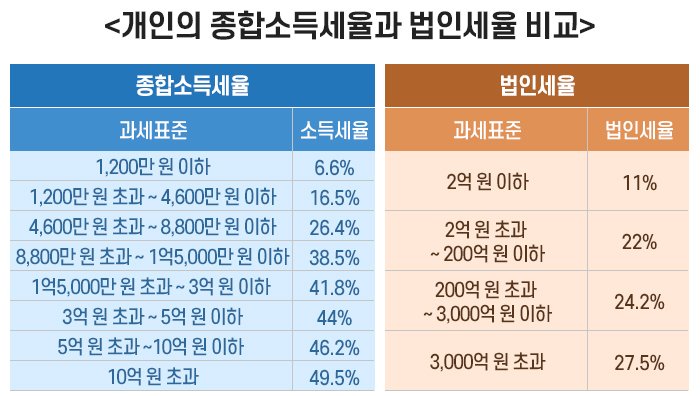 - 법인세율: 개인보다 약 20%P 낮음